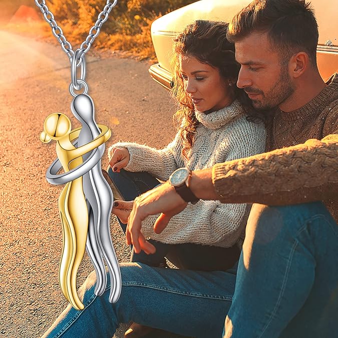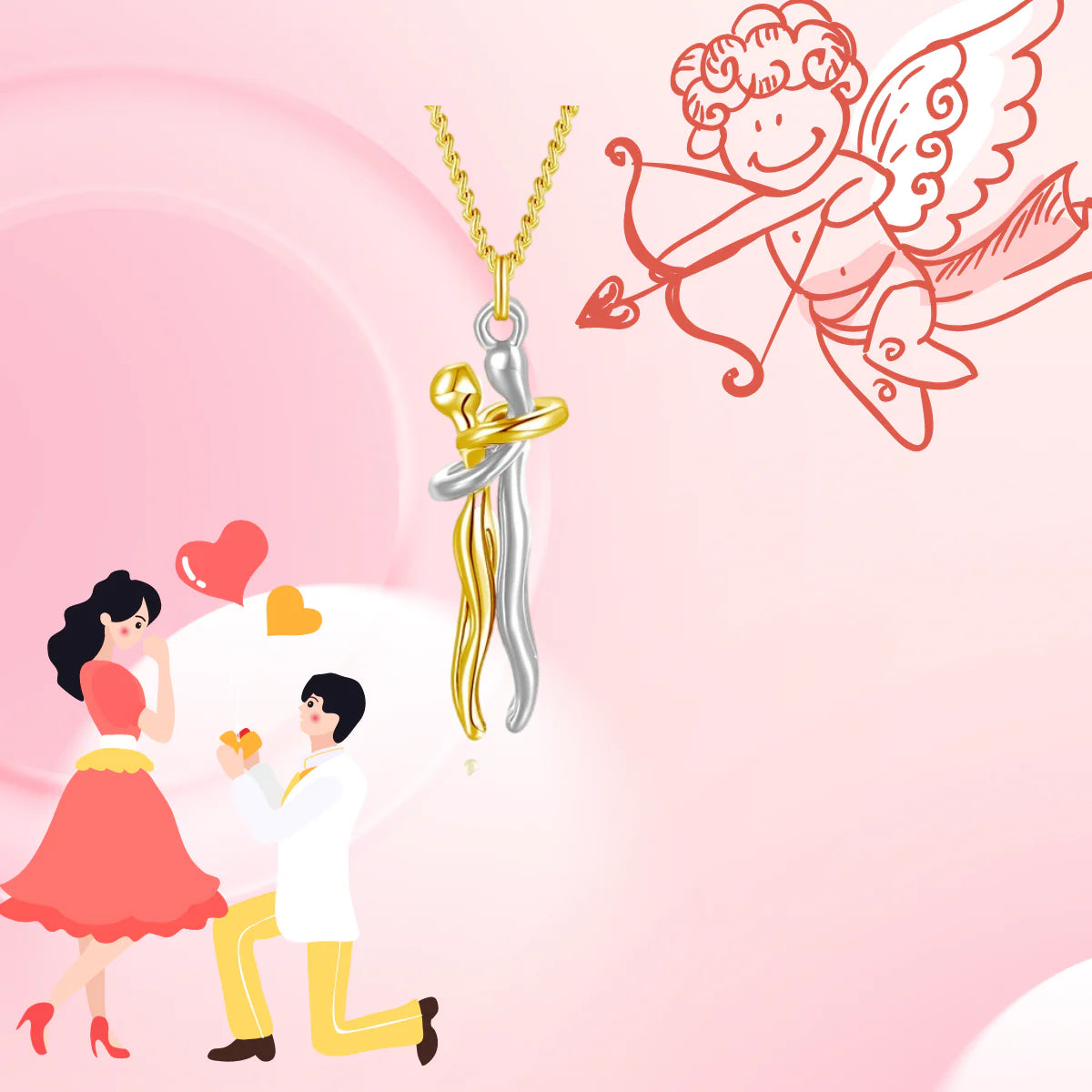 Designul unic al colierului reprezintă doi îndrăgostiți care se îmbrățișează, sculptați într-o formă elegantă și fluidă.