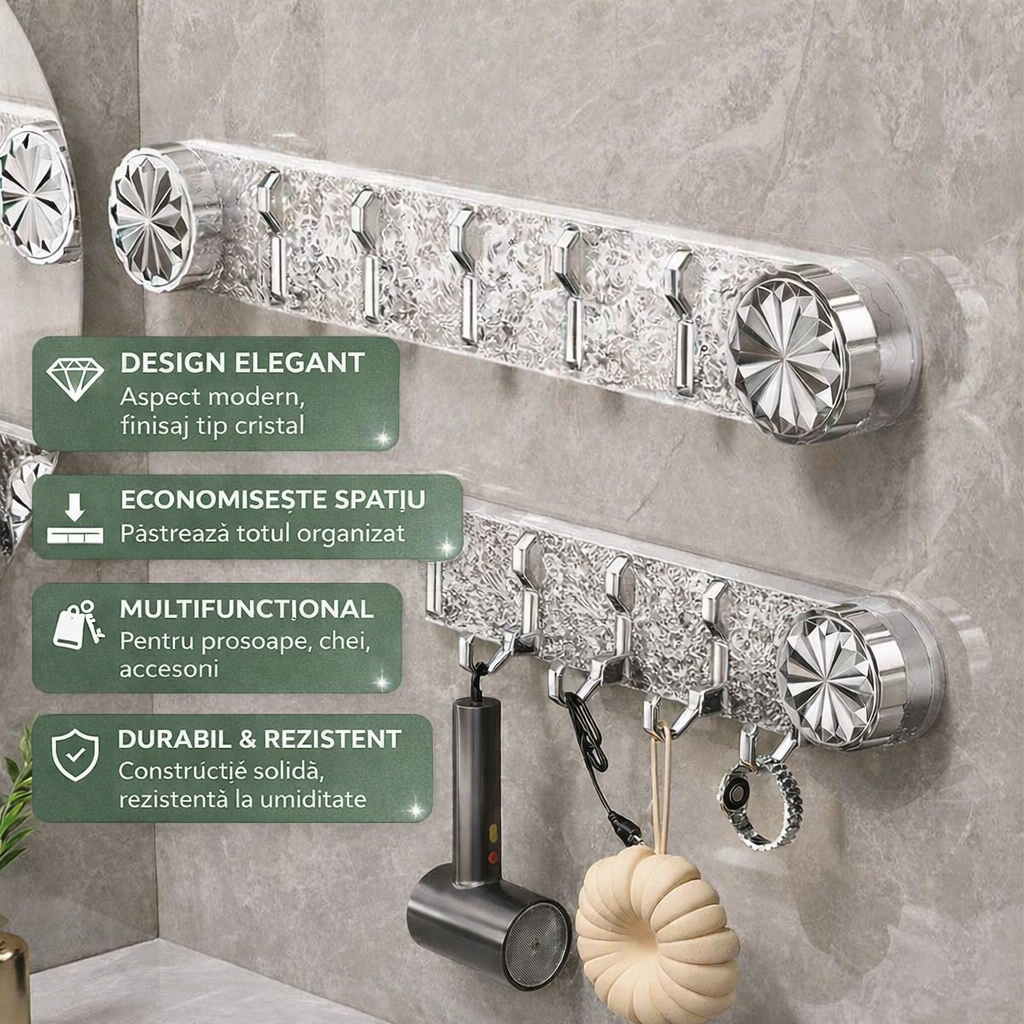 Realizat din materiale rezistente, cu un finisaj lucios tip cristal, acest sistem de prindere îți oferă 5 cârlige puternice pentru a păstra totul în ordine – de la prosoape, ustensile, cabluri până la uscătoare de păr sau accesorii.